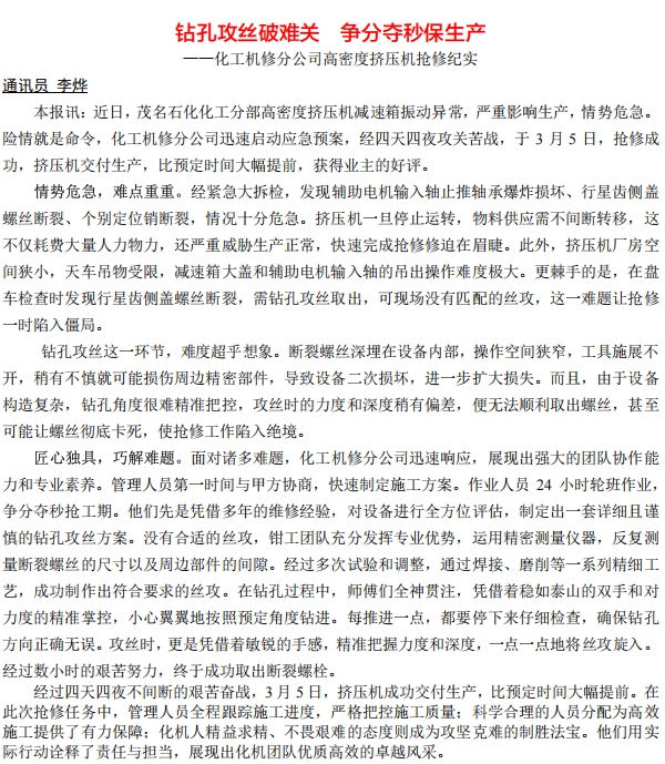 化工機(jī)修分公司高密度擠壓機(jī)搶修紀(jì)實(shí)