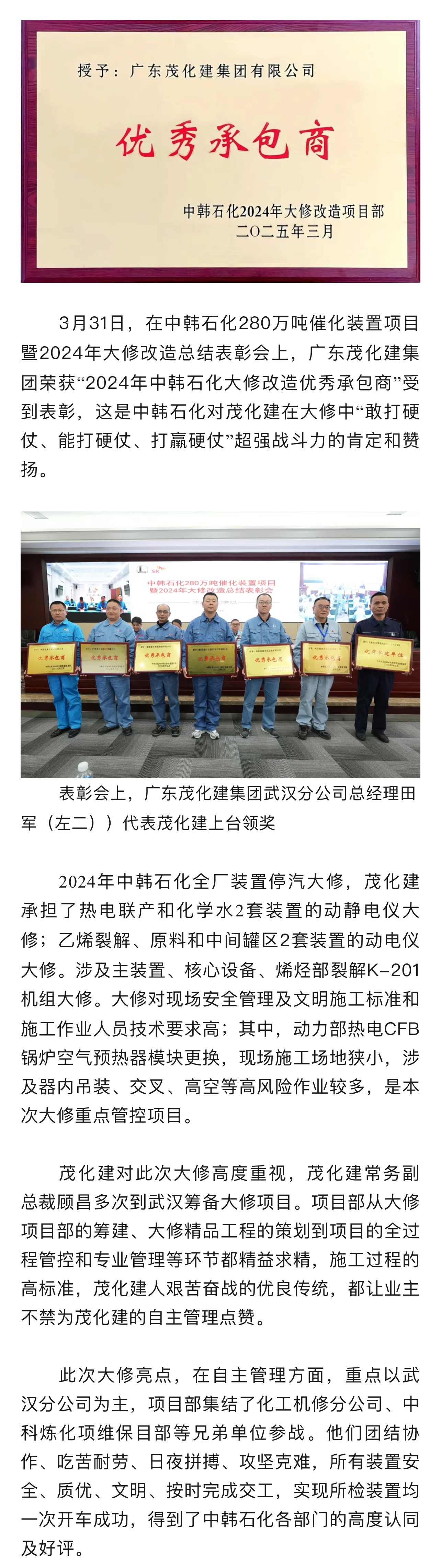 喜報(bào)|榮獲中韓石化2024年大修改造 “優(yōu)秀承包商”稱號