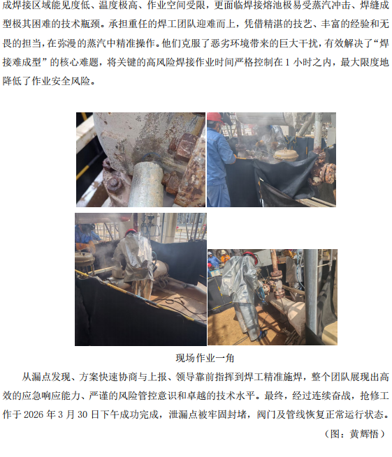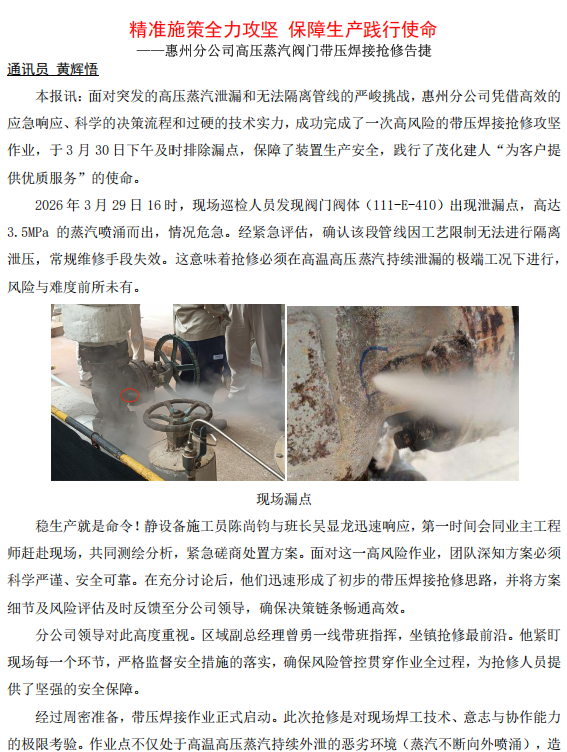 惠州分公司高壓蒸汽閥門帶壓焊接搶修告捷