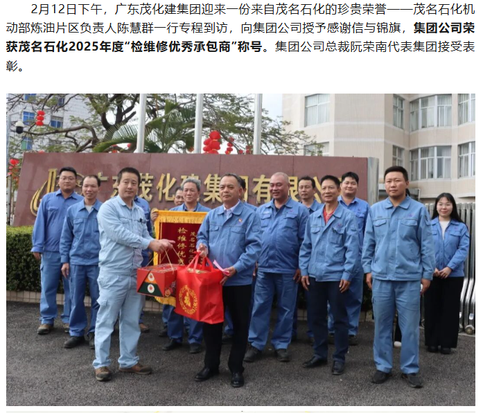 喜報(bào) | ?廣東茂化建集團(tuán)榮獲茂名石化2025年度“檢維修優(yōu)秀承包商”稱號(hào)并獲感
