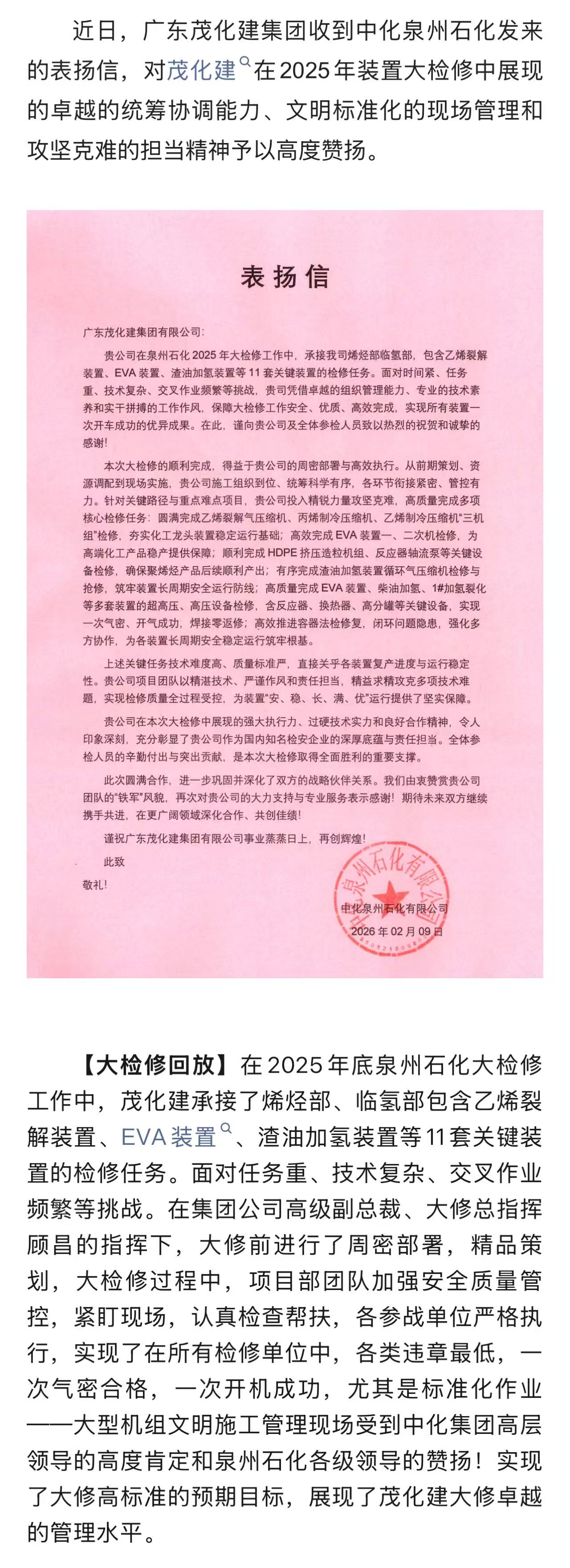 喜訊!茂化建收到泉州石化的表揚(yáng)信